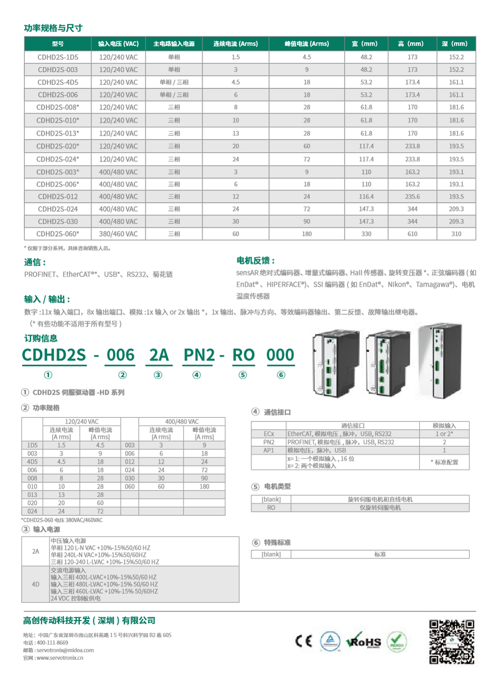 CDHD2S 是一种基于创新型技术和先进控制算法的高性能伺服驱动器。 CDHD2S 是在此系列伺服驱动器的第二代产品基础上迭代优化,在功能和性能方面取得了诸多改善和增强。 关于CDHD2S 驱动器各项选择,请参考订购信息。 使用中压电源(交流120–240V)的CDHD2S 驱动器称为中压型,使用高压电源(交流380–480V) 的驱动器称为高压型。