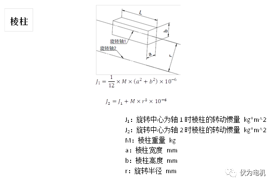 来源:伏为电机(广州)有限公司网址:http://www.fvmotor.com 在DD马达选型过程中,首先需要对其驱动的负载转动惯量进行评估,再结合系统要求的速度、精度、承载力、安装尺寸等多项性能指标进行综合评估,才可以选出最合适的电机型号。在整个选型过程中,最复杂的一个环节就是转动惯量的计算,本文总结了DD马达实际应用过程中最常见典型形状的负载转动惯量计算方式,希望能对广大工程师选型计算起到一定的帮助作用。 J2表示当物体的旋转中心,与其机械轴心发生偏移时的转动惯量,从上图公式中可以看出,当偏移距离越大,则物体的转动惯量越大,这也是为什么在计算重盘工件/治具部分惯量时,为什么需要了解其在转盘上的分布位置的原因。